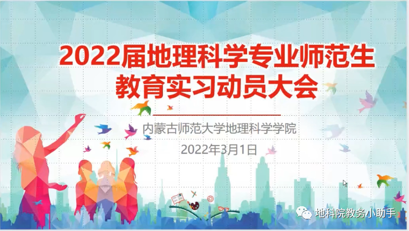 万象城awc官网登录入口于2022年3月3日上午举办2022届地理科学专业师范生教育实习动员大会。会议使用腾讯会议平台线上进行。呼和浩特市第三十六中学校长邹静薇、呼和浩特市土默特中学教师张瑜等基地校领导和老师莅临会场;万象城awc官网登录入口教学副院长萨楚拉、地理科学系主任乌敦、副主任周丹丹、咏梅、全体实习指导教师和152位实习生参会。大会由万象城awc官网登录入口教师赵伟主持。