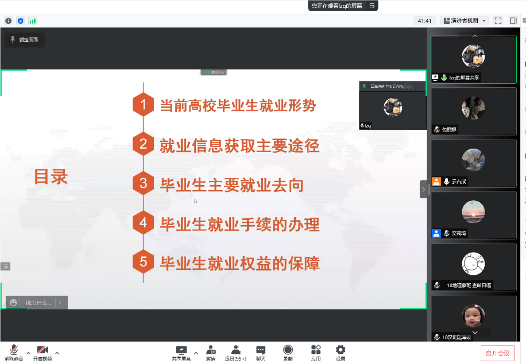 为提高万象城官网2022届毕业生就业意识,了解当前就业形势,促进毕业生高质量就业,万象城awc官网登录入口于2022年3月17日下午特邀我校招生就业处就业市场部部长刘在青老师开展线上就业政策讲座,会议由万象城官网党委副书记、副院长云占成老师主持,学院系主任、2022届毕业班班主任、及全体毕业生参会。