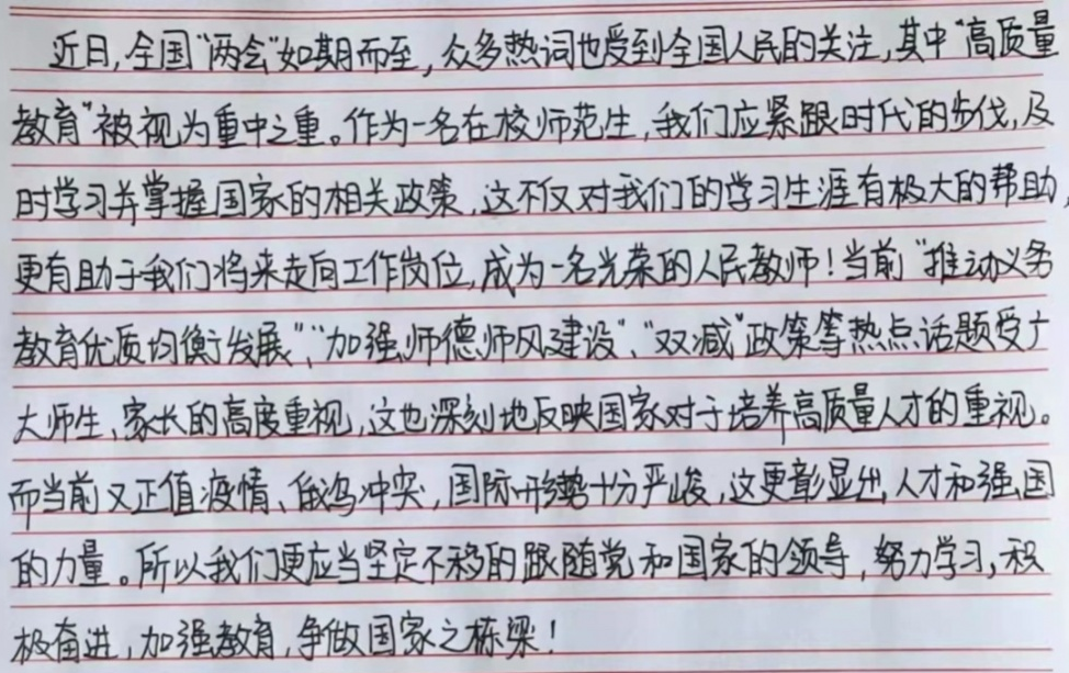 恰逢冬残奥会开幕之际,北京又迎来了“两会”胜利召开的伟大盛事。在期待着运动员们取得辉煌成绩的同时,我也在密切关注着2022年国家的发展规划。当前新冠疫情时有反扑、国际形势也变得错综复杂,我们的前进之路充满着困难与挑战。但是当我看到“两会”代表带着沉着,带着智慧,带着信心,从全国各地相聚北京,共商国是,我的心中备受振奋。我坚定地相信,在习近平总书记的坚强领导下,发挥中国新型政党制度的优势,坚持自我革命的战略思想,2022年我们国家一定能克服各种困难,取得更大的成就。我也相信在不久的时间里,呼市的疫情能够清零,我们也能回到那个心心念念、鸟语花香的校园里,能够与好朋友一起说笑打闹,能够与同学们在那教室里共同学习。当然我们在家上网课,也要努力克服一切困难,就如习近平总书记所讲的那样,不能把吃饭的工具所舍弃。