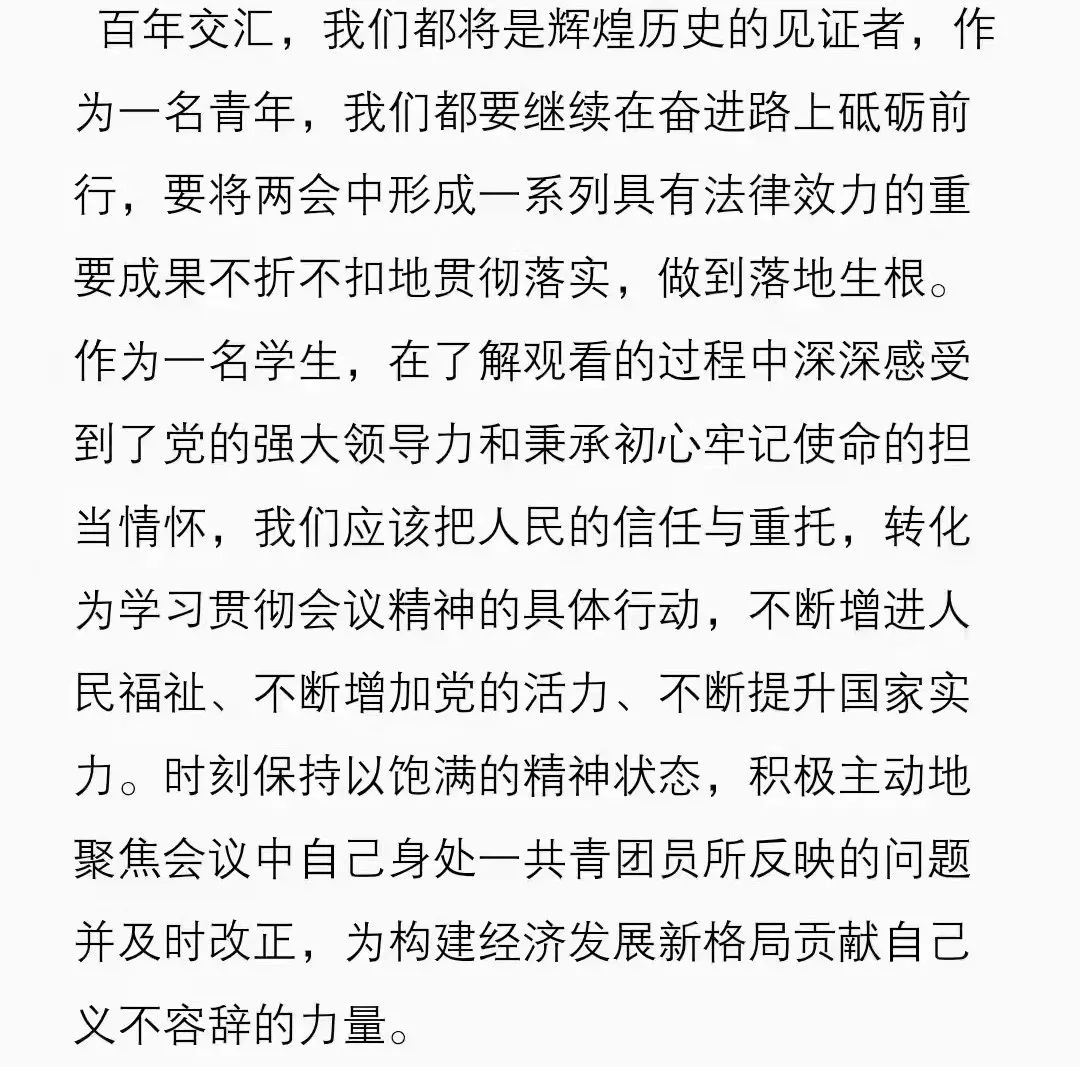 全国两会大幕开启,2022年 “两会”备受关注。“骐骥之速,非一足之力也。”新中国从站起来、富起来到强起来,是全国各族人民携手奋进、共同拼搏的结果。今年是“十四五规划的开局之年,我们更应该乘胜追击、乘势而上,绘制社会主义现代化建设的新蓝图。作为一名新时代青年大学生,我们也要积极担负起属于我们这一代人的使命与责任,学用结合,为“十四五”规划的实现与社会主义现代化强国建设贡献出属于自己的一份青春力量在如此新的历史关键节点,我们青年也应主动担当、积极作为,要坚定理想信念,将党的信仰作为思想、素质、修养不断提升的方向;作为新时代大学生,我会一直保持学习的热情,不断掌握真才实学,保持奋斗的姿态,做胸怀家国砥砺奋进的传承者,做脚踏实地扎根奉献的担当者,做勇立潮头敢为人先的开创者,让青春在为国家、为人民奉献中焕发出绚丽光彩!